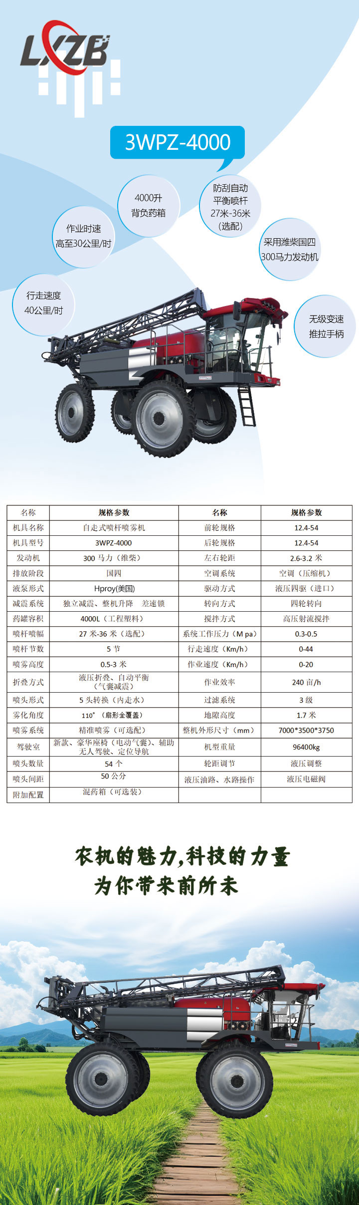 3WPZ-4000?噴藥切頂及一體的全液壓噴桿噴霧機(jī)。這款機(jī)器行走速度可達(dá)40公里每小時。作業(yè)時速可高達(dá)30公里每小時3WPZ-4000這款車搭配4000升背負(fù)式藥箱;30米防刮氣囊減震噴桿,搭配5頭轉(zhuǎn)換進(jìn)口噴頭。此機(jī)型采用濰柴國四排放標(biāo)準(zhǔn)300馬力發(fā)動機(jī),ACE?757升流量進(jìn)口泵,輪邊液壓驅(qū)動,進(jìn)口液系統(tǒng)由PMP公司配套以及售后。