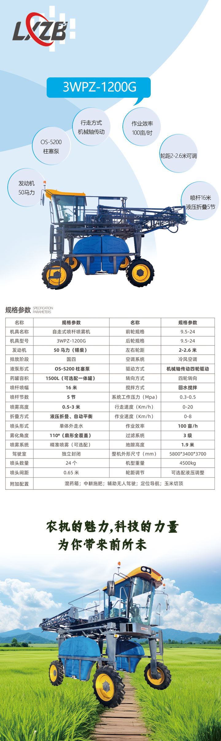 3WPZ-1200G自走式噴桿噴零機是一種集噴藥,切頂,施肥等功能于一體的噴藥設備此機型采用錫柴國四排放標準發(fā)動機50馬力,配備全封閉獨立駕駛室,05-5200柱塞泵,4+1共五個擋位4個前進擋位一個后退擋位。該機型行走方式采用機械軸傳動這款傳動方式在泥濘道路中驅動力強,脫因能力強,輪距2米-2.6米可調節(jié)(可選配液調節(jié)輪距)四輪驅動四輪轉向,輪距可調整,設計結構合理,維修便捷,作業(yè)質量好,作業(yè)效率可達每小時100畝。各項性能指標均超過國家有關標準要求。