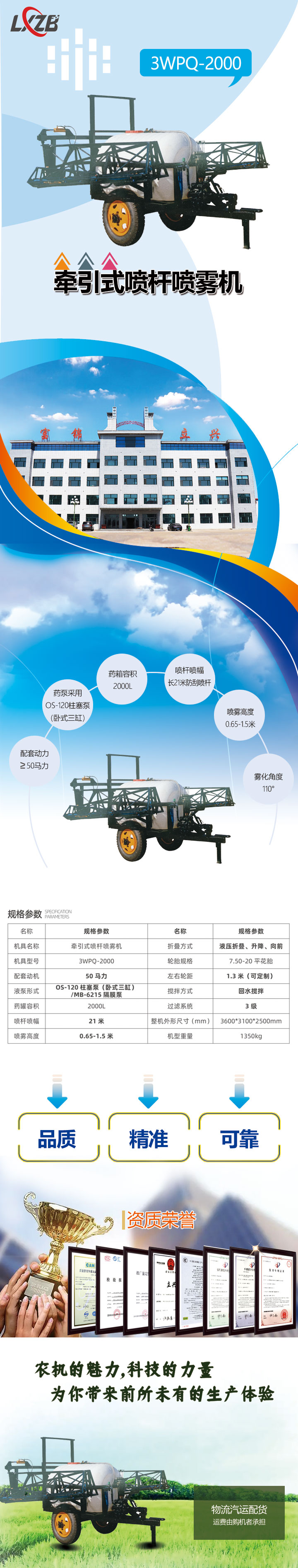3WPO-2000牽引式噴桿噴霧機(jī),配套動(dòng)力250馬力,藥泵采用0S-120柱塞泵(臥式三缸)或MB-6215隔膜泵,配有三級(jí)過(guò)濾系統(tǒng),回水?dāng)嚢韫δ?,藥箱容積2000L,噴桿噴幅長(zhǎng)21米防刮噴桿,噴零高度0,65-1.5米,零化角度110°,噴桿液壓折疊、升降,左右輪距1.3米(可定制》,地隙高度0.5米,適合小馬力機(jī)型牽引車頭,中小型地塊噴灑作業(yè)需求。