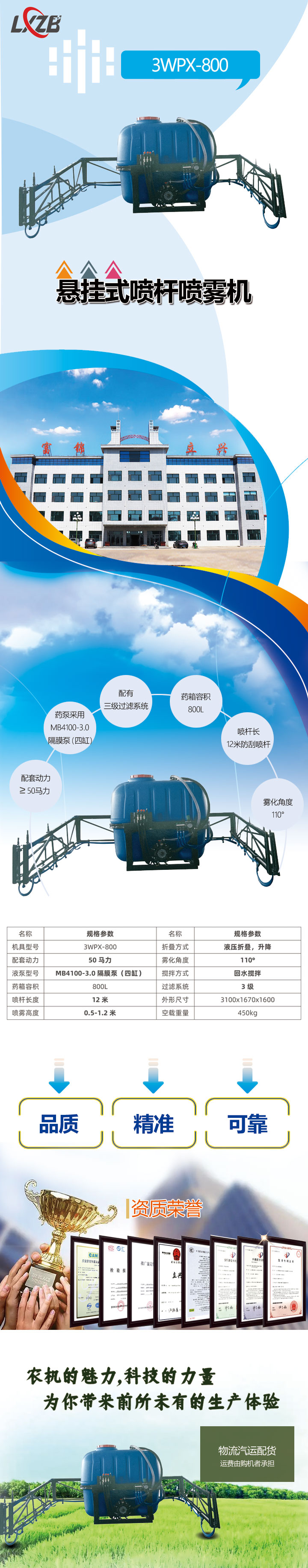 3WPX-800懸掛式噴桿噴霧機配套動力250馬力,藥泵采用MB4100-3.0隔膜泵(四缸),配有三級過濾,回水攪拌功能,藥箱容積800L,噴桿長12米防刮噴桿,噴霧高度0.5米-1.2米,霧化角度110°,噴桿液壓折疊、升降,小容積懸掛噴桿噴霧機更適合小地塊矮作物的作業(yè)。