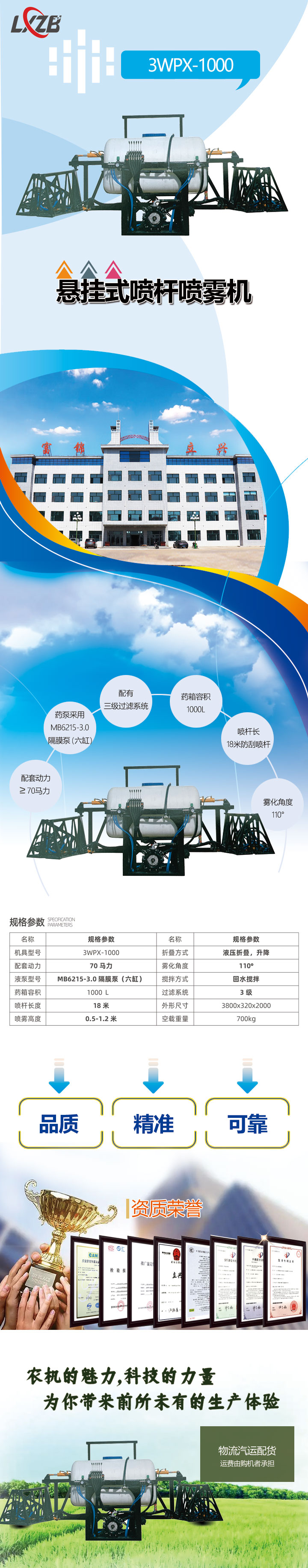 3WPX-1000懸掛式噴桿噴霧機配套動力270馬力,藥泵采用MB6215-3.0隔膜泵(六缸),配有三級過濾,回水攪拌功能,藥箱容積1000L,噴桿長18米防刮噴桿,噴霧高度0.5米-1.2米,要化角度110°,噴桿液壓折魯、升降,藥箱容積的提升,節(jié)省了加藥時間,更適合大地塊的噴霧作業(yè)。